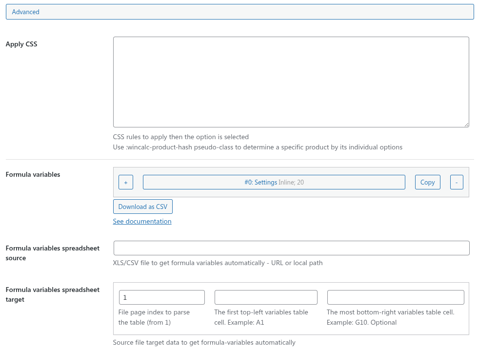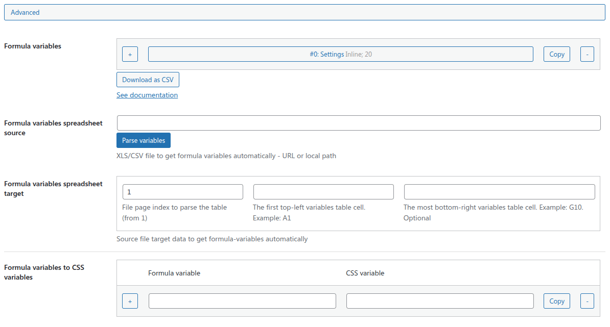 Formula variables spreadsheet source setting allows setting the URL or local path to a spreadsheet file with individual variables and formulas. It supports XLS or CSV file extensions. To get the correct format of the file content, fill a few custom variables into the setting, save them, and then click «Download as CSV» button to see the columns and variables data markup.