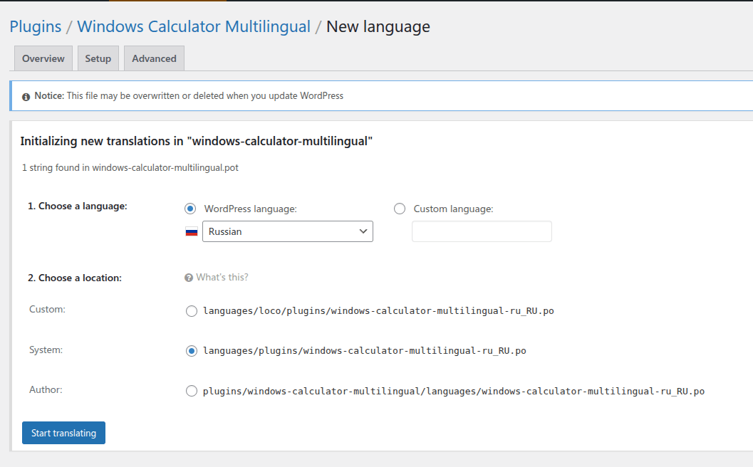 Choose the required translation language first, and "Custom" or "System" for translation location to not store this file within the addon plugin folder to not lose it in case of plugin update or remove.