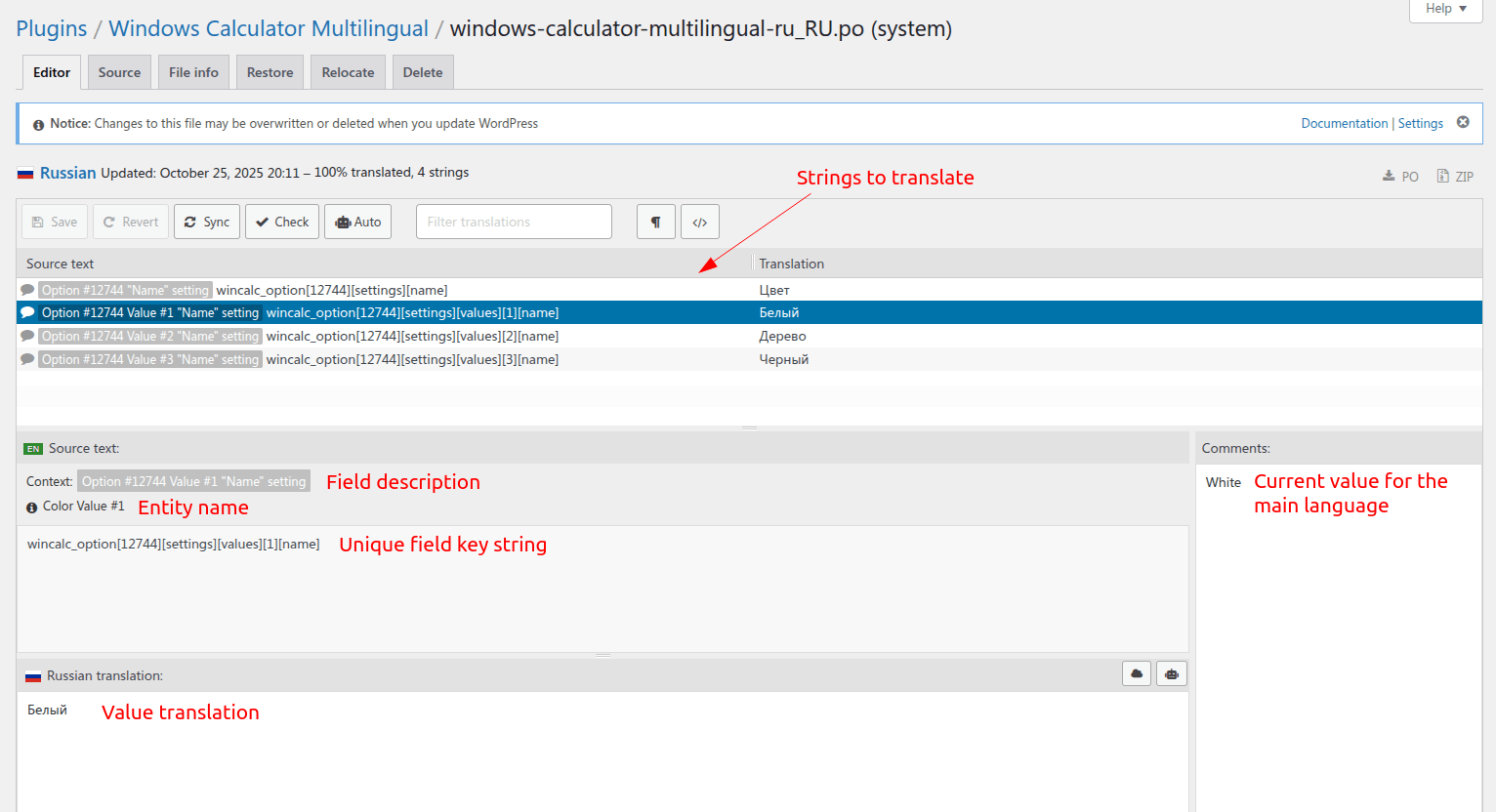 Please keep in mind, data about selected fields to be translatable is stored right within the multilingual addon under languages/windows-calculator-multilingual.pot file. In case of plugin remove or update, this information can be lost.