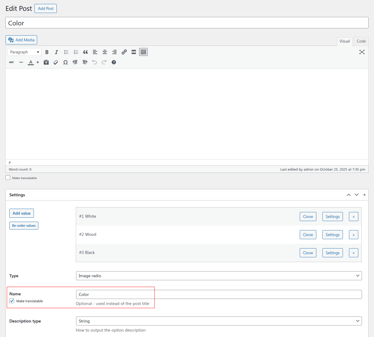 At the result, used field value will be automatically translated to the current site language using only the native WordPress mechanism.