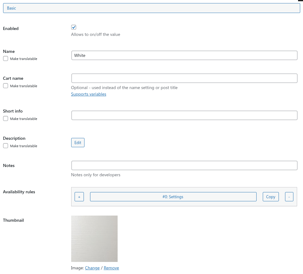 Variations setting controls what variations will be available to select for the product. Each product must have at least one variation and can have only one active variation at once. There will be special controls available to select one of a few product variations.